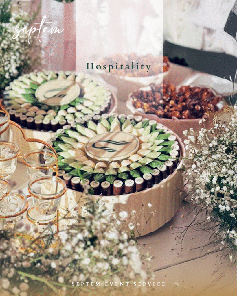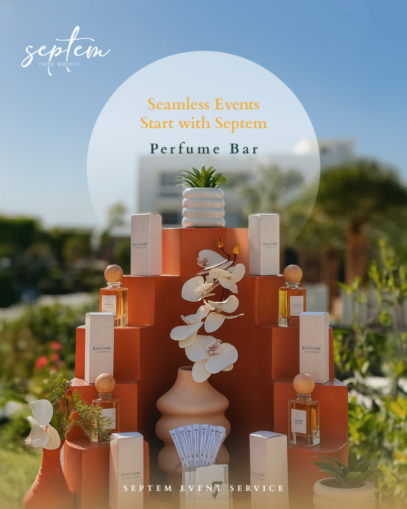 Septem Event Services offers seven premium services: Perfume Bar, Hospitality, Security Services, Perfume Corner, Entertainment, Catering & Finger Food, and Candy Corners, each tailored to match the client’s vision and objectives.