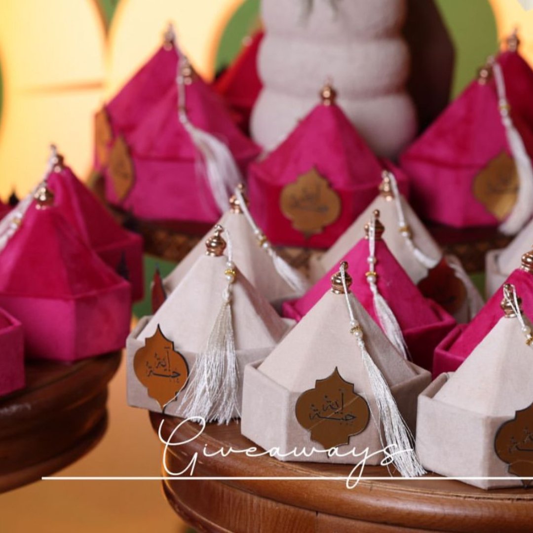 Our curated range includes customizable items such as lip gloss, hand cream, diffusers, scented candles, tasbih, incense, Zamzam water, mini Qurans, mirrors, hand fans, and more. Each piece is elegantly packaged to align seamlessly with your event theme, color palette, and brand identity.